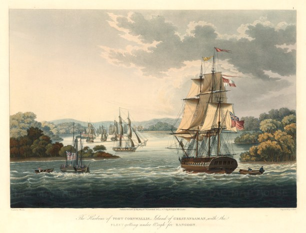 British fleet in harbour of Port Cornwallis, Island of Great Andaman, with HMS Sophie on right, by Lieutenant Joseph Moore – National Maritime Museum